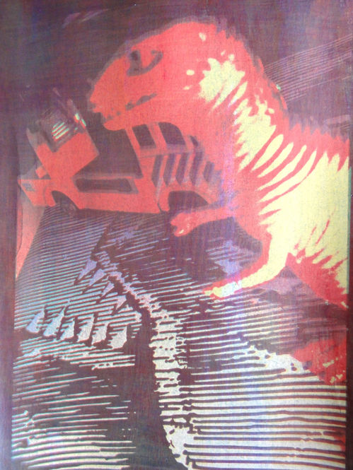 De graafmachine tegen de dinosaurus in 3 bijzondere goedrukken weergegeven.